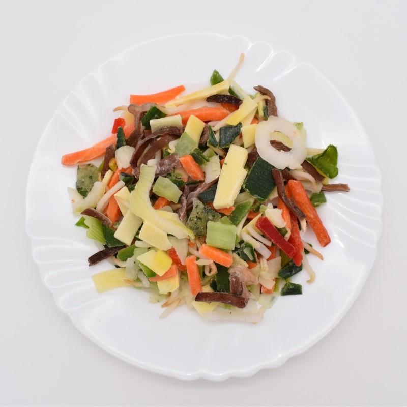 Muguri de bambus, mazăre păstăi fragedă, ceapă, varză albă, ciupreci shiitake, ardei roșu, ardei verde, praz în proporții variabile.