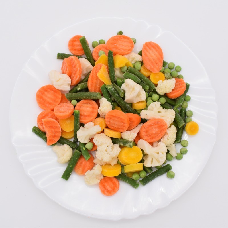 Morcov galben, morcov portocaliu, conopidă, fasole verde, mazăre boabe în proporții variabile.