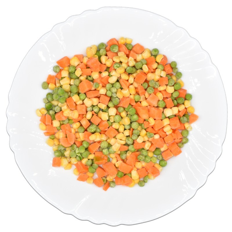 Morcov cubulețe, mazăre boabe, porumb boabe în proporții variabile.