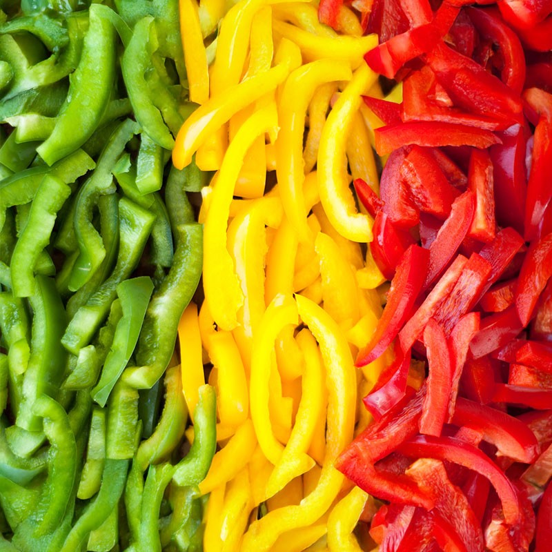 Ardei roșu feliat, ardei verde feliat, ardei galben feliat în proporții variabile.