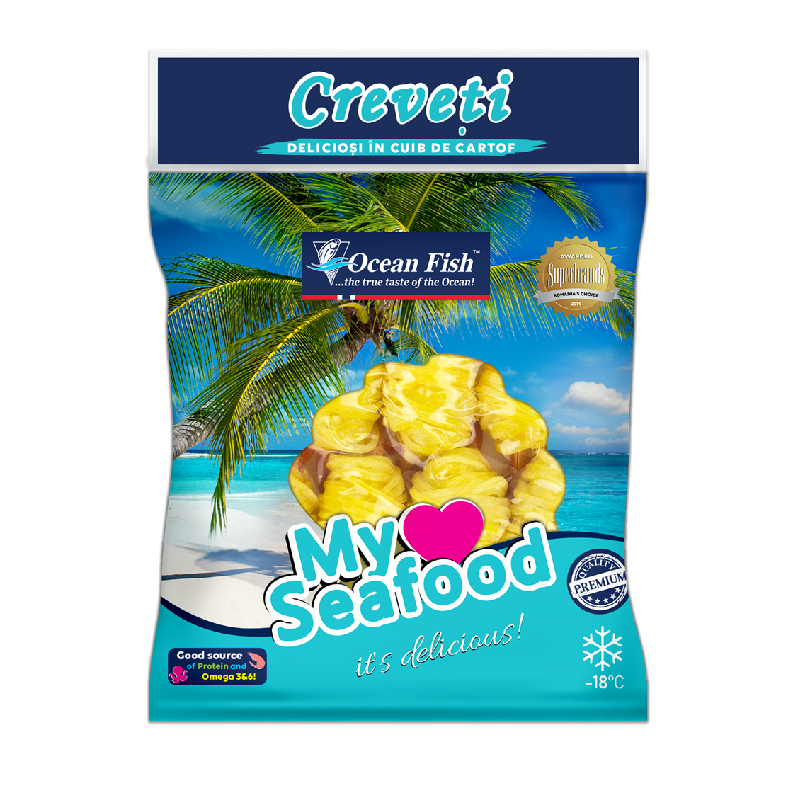 (117,22 lei per kg)Creveți în cuib de cartofi, congelați, prefierți, 25 G/ buc, 20x 500 G/ caserolă.
