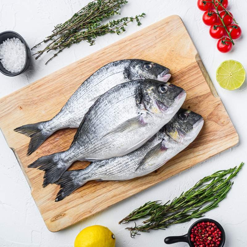 Doradă eviscerată 80%, apă 20%.