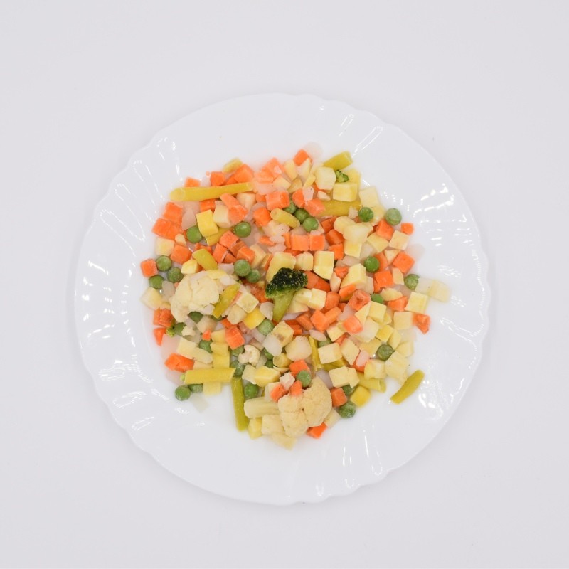Cartofi cub, Ceapă cub 10×10, Mazăre verde, Morcovi cub 10×10, Fasole galbenă, Păstârnac cub 10×10, Țelină cub 10×10, Broccoli, Conopidă în proporții variabile.